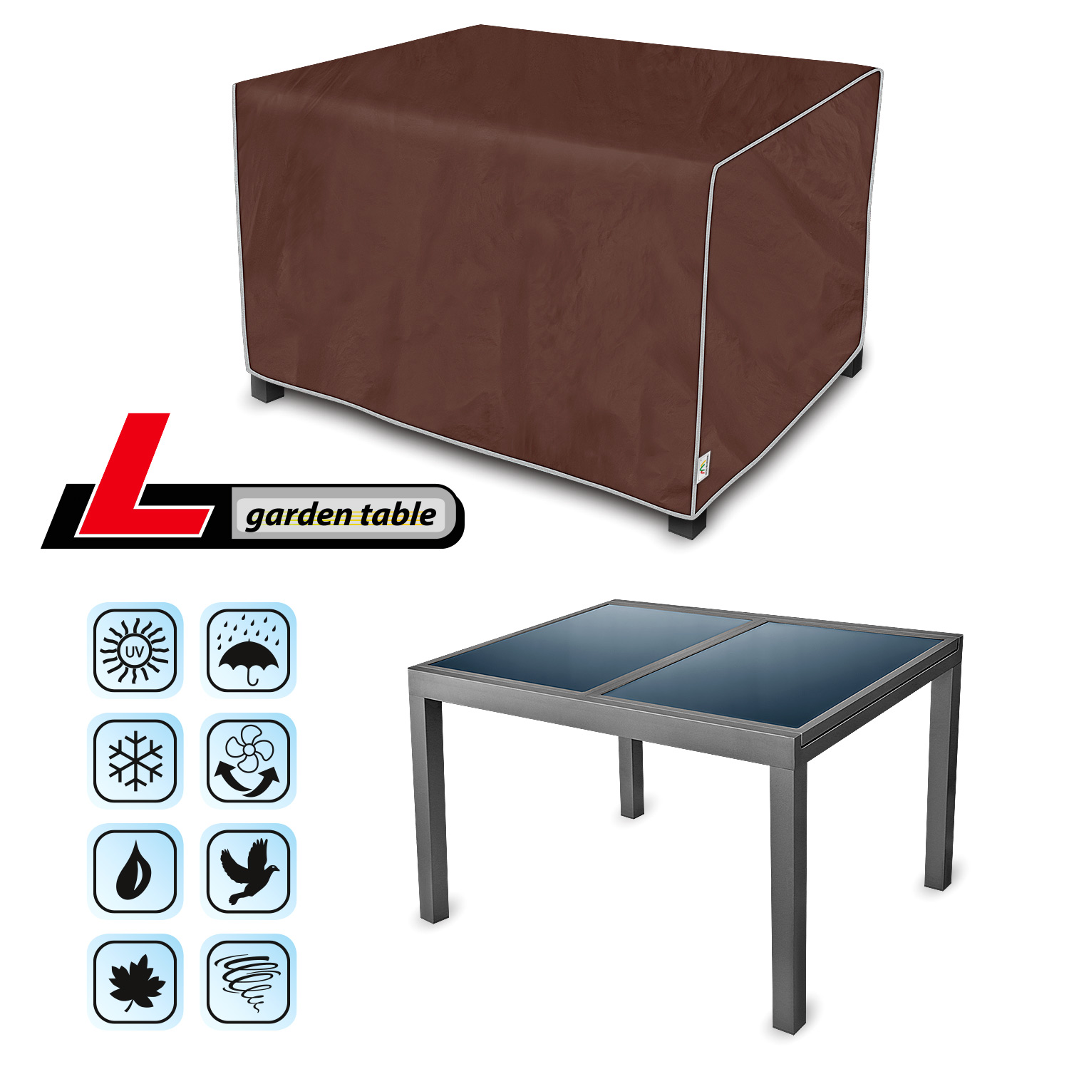 Całoroczny pokrowiec do ochrony stołu ogrodowego przechowywanego na zewnątrz przed niekorzystnym wpływem środowiska. Dzięki specjalnej konstrukcji woda podczas deszczu spływa po pokrowcu nie wnikając pod pokrowiec. Chroni stół przed deszczem, śniegiem, szronem i promieniami słonecznymi (szkodliwym UV) oraz zanieczyszczeniami jak pył, ptasie odchody i soki z drzew. Ogranicza korozję i starzenie się elementów z tworzyw sztucznych lub drewna, chroni przed blaknięciem i matowieniem lakieru oraz elementów chromowanych. Pokrowiec jest w pełni odporny na wszystkie warunki atmosferyczne. Łatwy do zakładania i ściągania. Dodatkowe zapięcia zabezpieczają przed zerwaniem pokrowca przez wiatr. Odpowiedni także do użytku wewnątrz pomieszczeń.